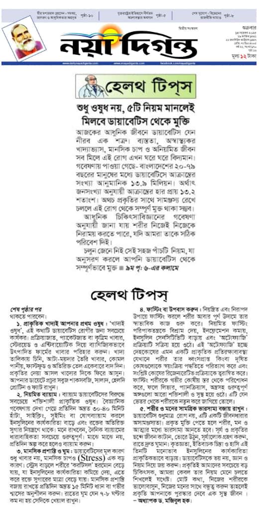 নয়া দিগন্ত – হেলথ টিপস: “শুধু ওষুধ নয়, ৫টি নিয়ম মানলেই মিলবে ডায়াবেটিস থেকে মুক্তি”