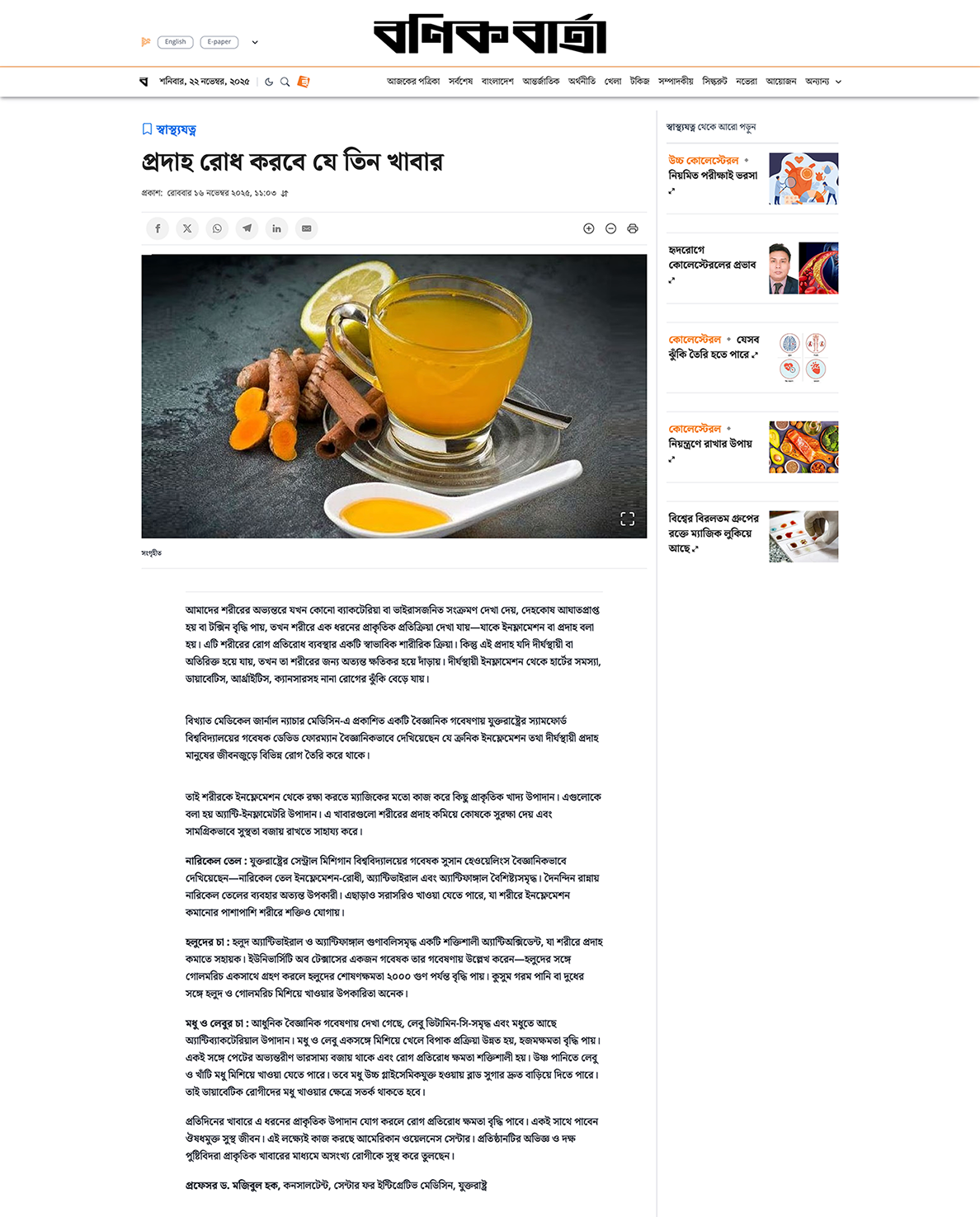 প্রফেসর ড. মজিবুল হক-এর মতে, দৈনন্দিন খাদ্য তালিকায় এই তিনটি প্রাকৃতিক অ্যান্টি-ইনফ্লামেটরি উপাদান যোগ করলে—