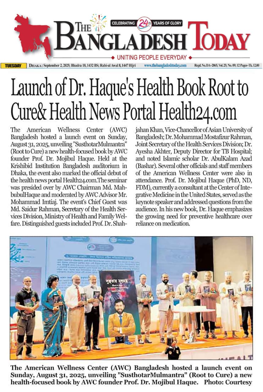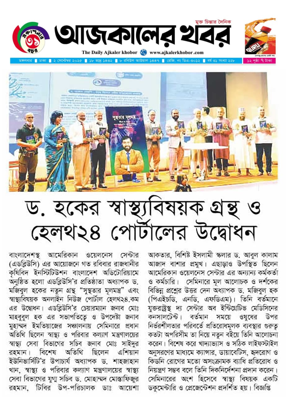 ড. মজিবুল হকের নতুন গ্রন্থে জীবনধারাভিত্তিক সুস্থতার দিকনির্দেশনা বাংলাদেশস্থ আমেরিকান ওয়েলনেস সেন্টার (AWC)-এর আয়োজনে অনুষ্ঠিত হয়েছে অধ্যাপক ড. মজিবুল হক (PhD, ND, FDM)-এর নতুন স্বাস্থ্যবিষয়ক গ্রন্থ “সুস্থতার মূলমন্ত্র” এবং অনলাইন স্বাস্থ্য পোর্টাল Health24.com-এর উদ্বোধন। অনুষ্ঠানটি অনুষ্ঠিত হয় গত রবিবার রাজধানীর কৃষিবিদ ইনস্টিটিউশন বাংলাদেশ অডিটোরিয়ামে এক বর্ণাঢ্য সেমিনারের মাধ্যমে।